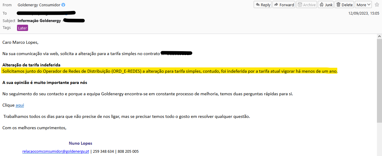 O que é dito neste email enviado pela Goldenergy é FALSO!!! Acabei de falar com a E-REDES!