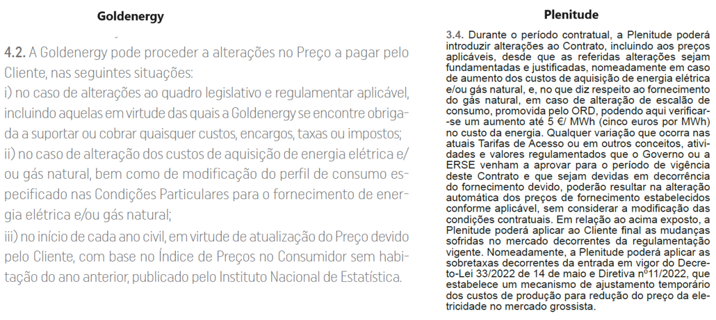 "3.4. Durante o período contratual, a Plenitude poderá introduzir alterações ao Contrato, incluindo aos preços aplicáveis, desde que as referidas alterações sejam fundamentadas e justificadas, nomeadamente em caso de aumento dos custos de aquisição de energia elétrica e/ou gás natural"