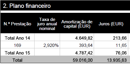 Financiamento de 59.016€ a 15 anos taxa de juro 1.9% ; custo de financiamento 13.935,63€