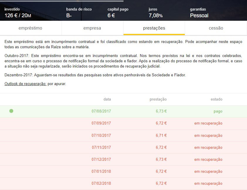 Na Lenndy tem a opção com e sem buyback, investi sem buyback e arrenpendi-me, 2 ativos arrastaram-se e um deles andou 6 meses em recuperação, chegou a um ponto o vendedor teve que se chegar a frente... abaixo deixo a informação em anexo... era um activo de 12% a 3 meses (fatura) não é as taxas ridiculas que a Raize pratica e dp brincam ás execuções de garantias pessoais....