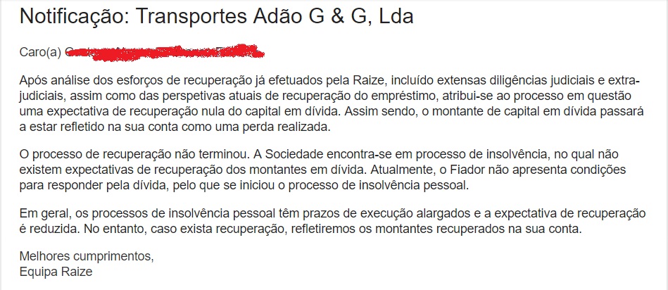 Após análise dos esforços de recuperação já efetuados pela Raize, incluído extensas diligências judiciais e extra-judiciais, assim como das perspetivas atuais de recuperação do empréstimo, atribui-se ao processo em questão uma expectativa de recuperação nula do capital em dívida. Assim sendo, o montante de capital em dívida passará a estar refletido na sua conta como uma perda realizada.