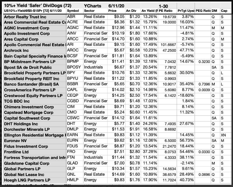 Encontrei esta lista (falta aqui a segunda pagina) de empresas e os seus dividendos, num servidor Discord Portuguese de investimentos (publico, posso partilhar), encontra-se algumas empresas bem conhecidas a pagar taxas altas, com isto já é de Maio podem não ter cortado ao dividendo. Algumas delas tem taxas realmente muito altas, considerando que as REITs são obrigadas a distribuir 95% dos rendimentos é de esperar que algumas venham a cortar, mas no futuro voltar a subir. Outra grande parte que aparece são as MLPs que são conhecidas por pagarem um bom dividendo.