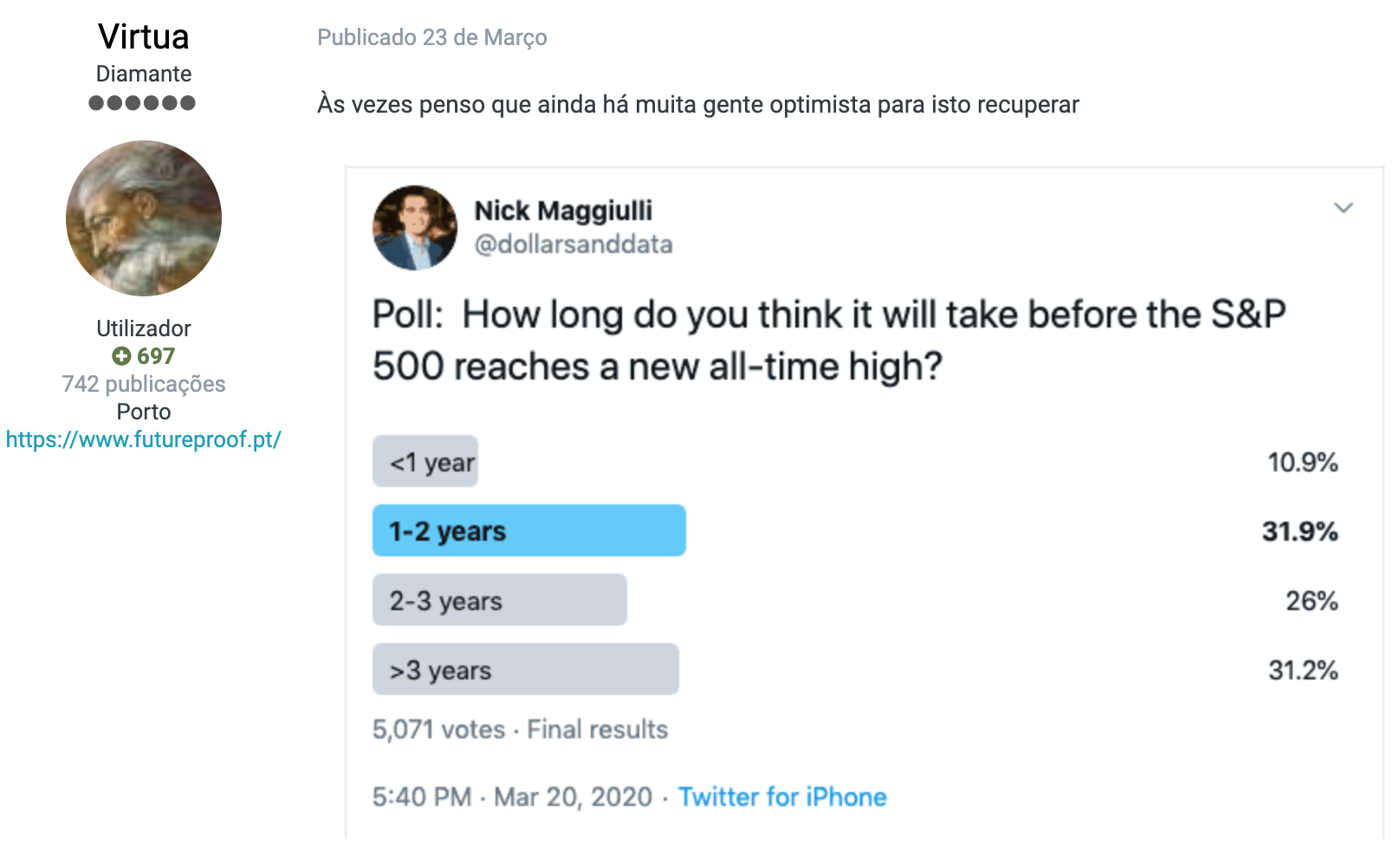 Pelo menos apercebo-me que já consigo distinguir sentimentos/emoções de comportamentos. No mesmo dia coloquei on-line este artigo: https://www.futureproof.pt/blog/o-dia-em-que-se-quis-vender-tudo onde digo " Estar a ser a queda mais rápida de sempre trouxe as desvantagens que todos sabemos mas por outro lado pode rapidamente criar boas oportunidades de longo prazo já num futuro próximo.". Por outro lado já tive a oportunidade de dizer que tentei comprar S&P alavancado 3x nesse dia, não consegui porque tinha o BI desatualizado no BEST (primeiro trade especulativo em mais de 10 anos).