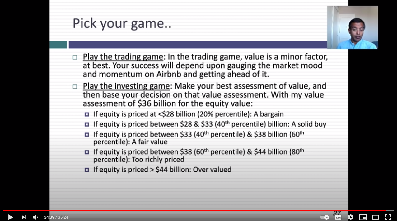Tens uma analise do Aswath Damodaran, um dos melhores professores de valuation do mundo. Ele analisou todas as potenciais revenue streams da Airbnb. E chegou à conclusão de que se a empresa estivesse avaliada em mais de 44 mil milhões que estaria sobre avaliada.