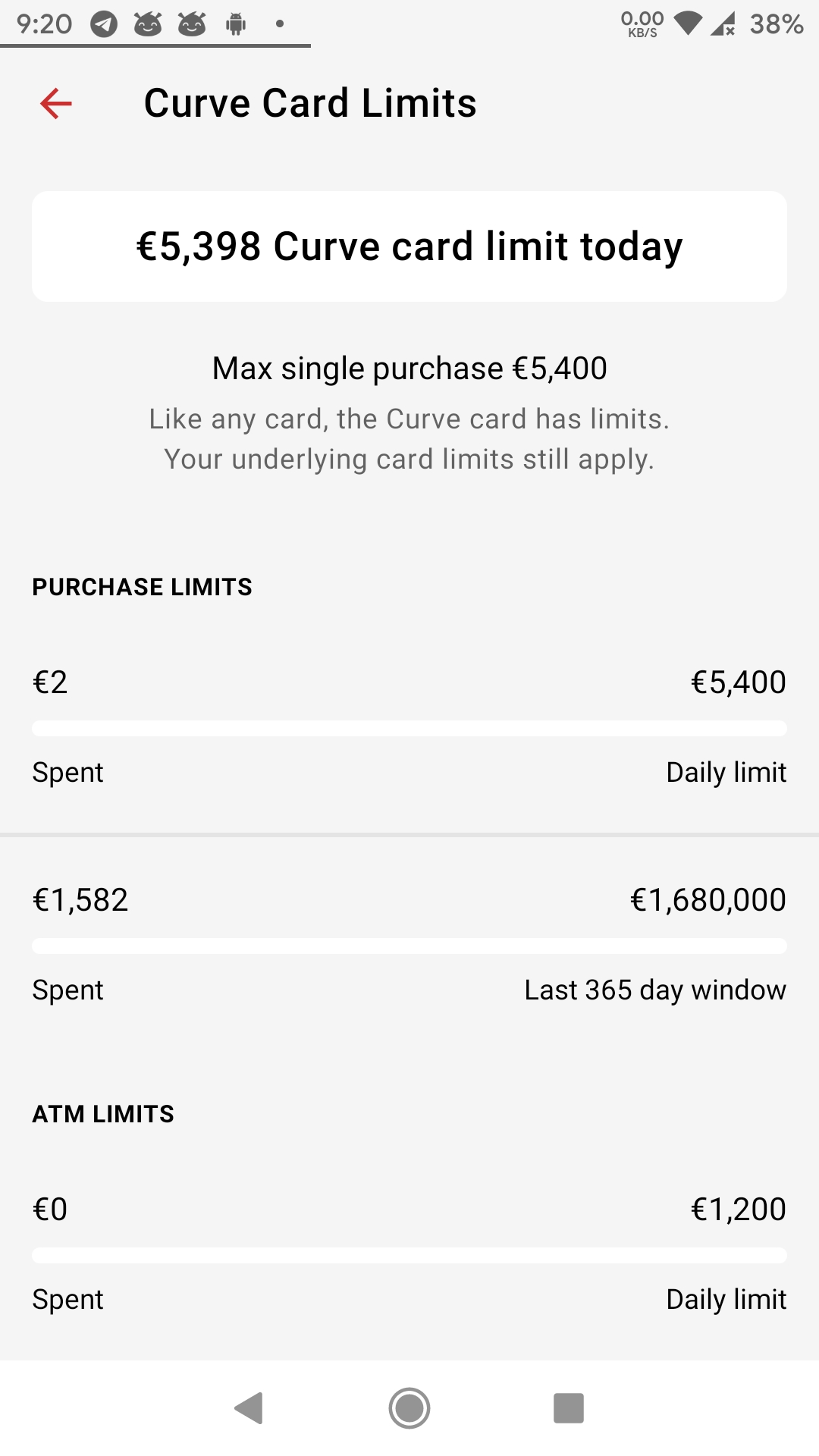 O meu Curve Card Limits está em Libras e menciona limite anual de £1,600,000.