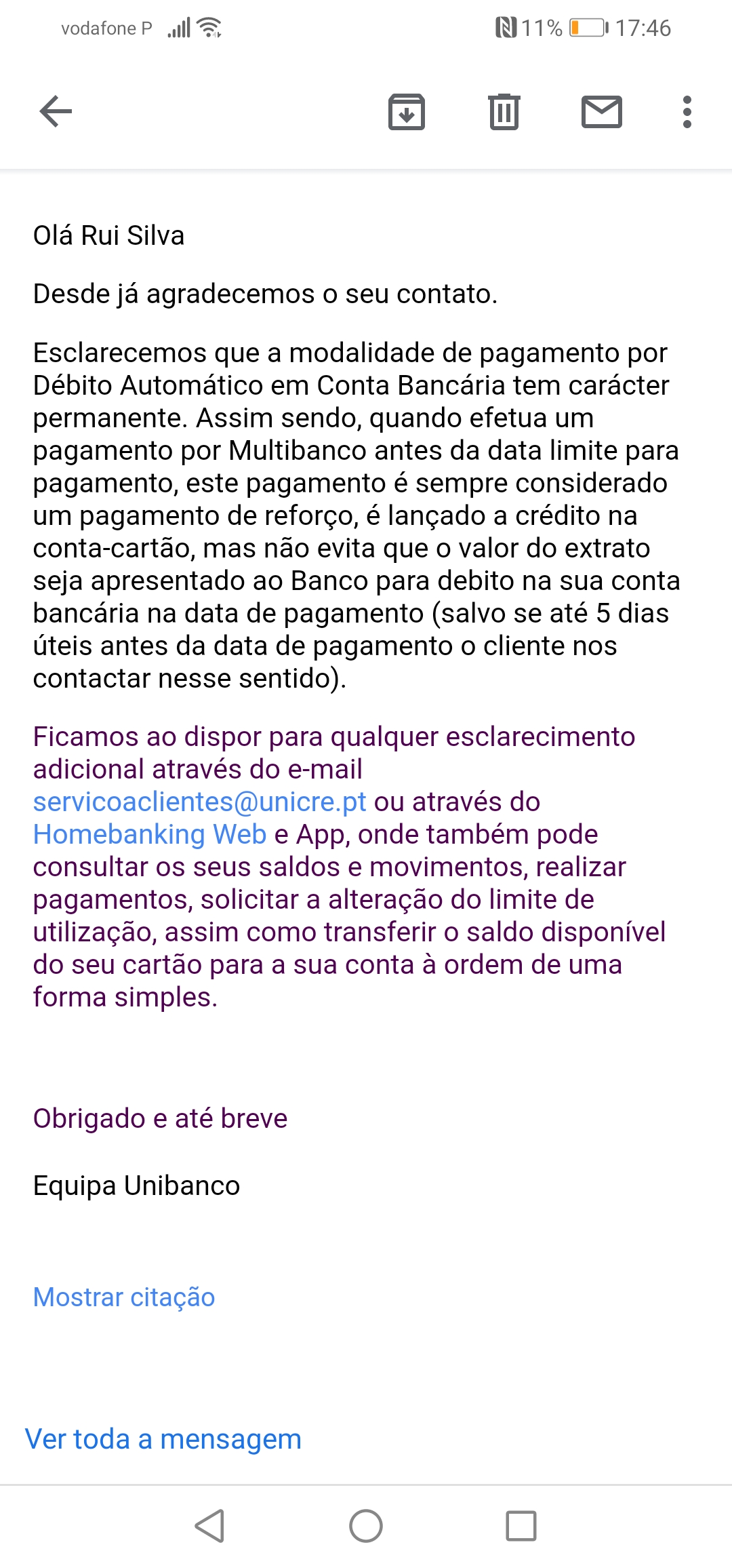 Fica aqui a resposta do suporte da Unibanco à minha pergunta acerca de como funciona o débito direto se pagarmos antes por referência multibanco antes do dia limite
