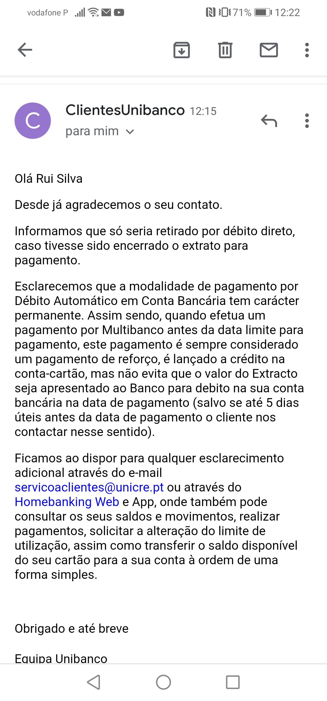 É bom teres-te "estreado" com o Unibanco, pois nem todos os outros têm um apoio ao cliente de tão fácil/rápido acesso.