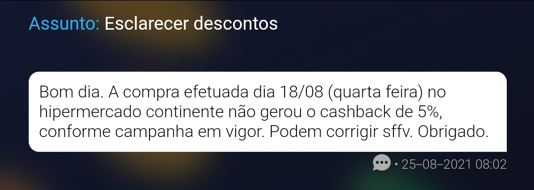 E apesar de comigo serem valores maiores de cashback, começo a pensar que não justificam o trabalho que tenho em lidar com o suporte do Universo. Juros inventados, cashbacks não creditados, etc... Quase não vale a pena.