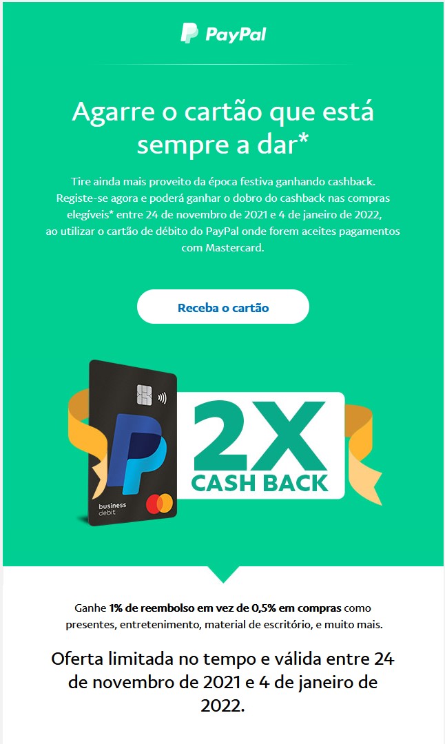 As contas PAYPAL comerciais, agora podem ter um cartão de débito físico com 0,5% de cashback, e neste momento estão com uma promoção de 1% de cashback.