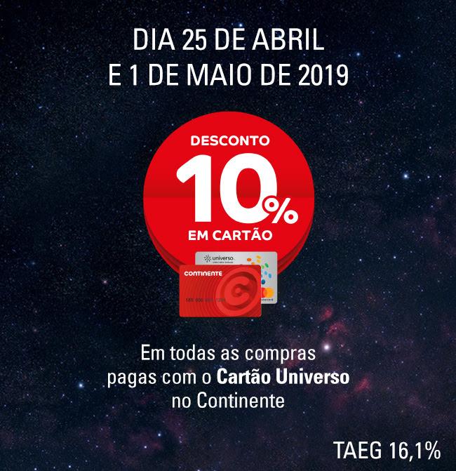 Dia 25 abril e dia 1 de maio, 10% em cartão em compras no Continente pagas com o cartão Universo.