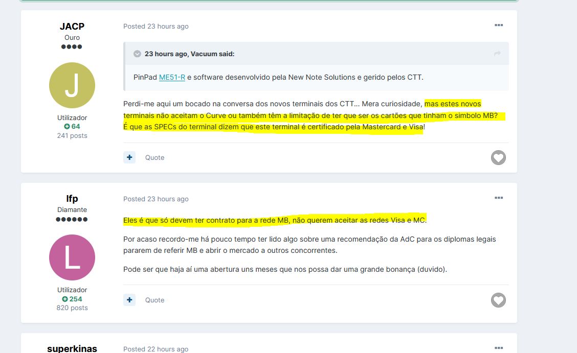 People, na 6f fui subscrever certificados de aforro, a mulher dos CTT disse que hoje ia mudar muita coisa com os pagamentos com cartão. A mulher estava chateada comigo por causa de eu estar a fazer vários pagamentos com o wizink para não passar a entidade. Tinha um terminal antigo , disse-me que não podia usar porque estava limitado a 316€ por aforrista por dia!. Tive que usar um novo.