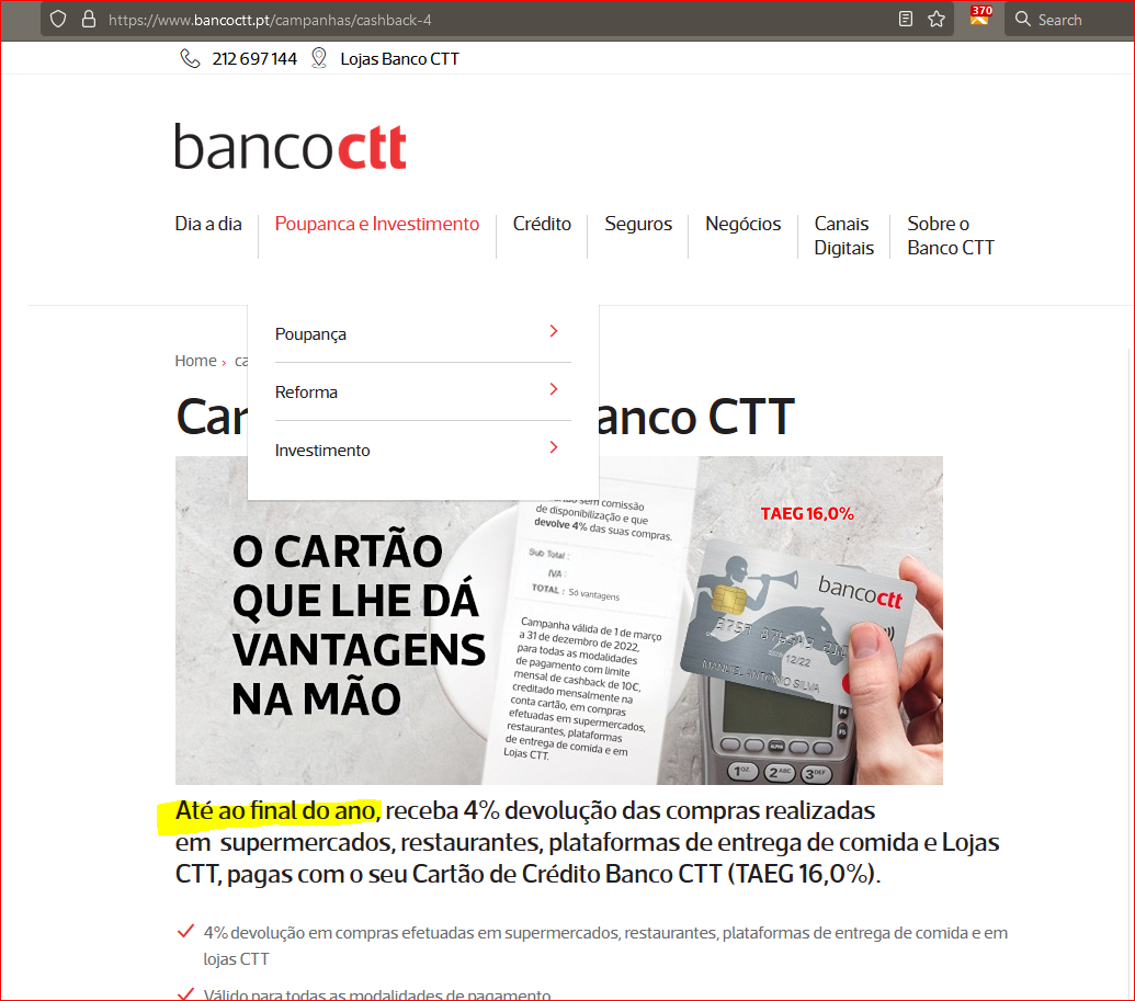 Cartão CTT os 4% cashback e 1O euros cashback mês e só 1 ano  ou não tem tempo. Por exemplo 400 euros certificados da 10 euros mês