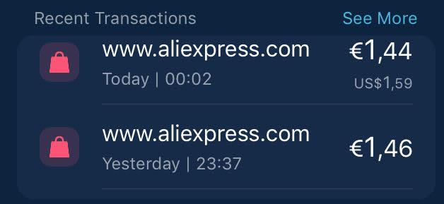 Recuperando uns testes que iniciei na semana passada de comprar no Aliexpress usando várias modalidade de conversão, a moeda nativa do Aliexpress é o USD, portanto fiz:;