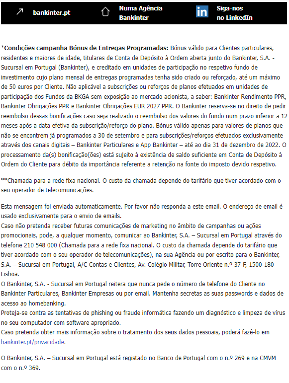 Recebi um email do Bankinter com a seguinte informação: