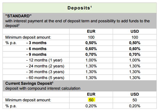 Os 50 EUR que indicas são o mínimo inicial das contas poupança, que têm um juro baixíssimo. O que te estava a sugerir era um depósito "STANDARD" a 2, 3 ou 5 anos, que também permite reforços e penso que sem montante mínimo. Podes perguntar (em inglês) em https://www.privatbank.pt/pt/voprosi-jalobi-predlojeniya/