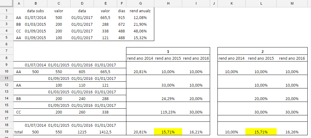 Exemplo: como calcular o ganho no ano 2015 da totalidade da carteira de investimento ?