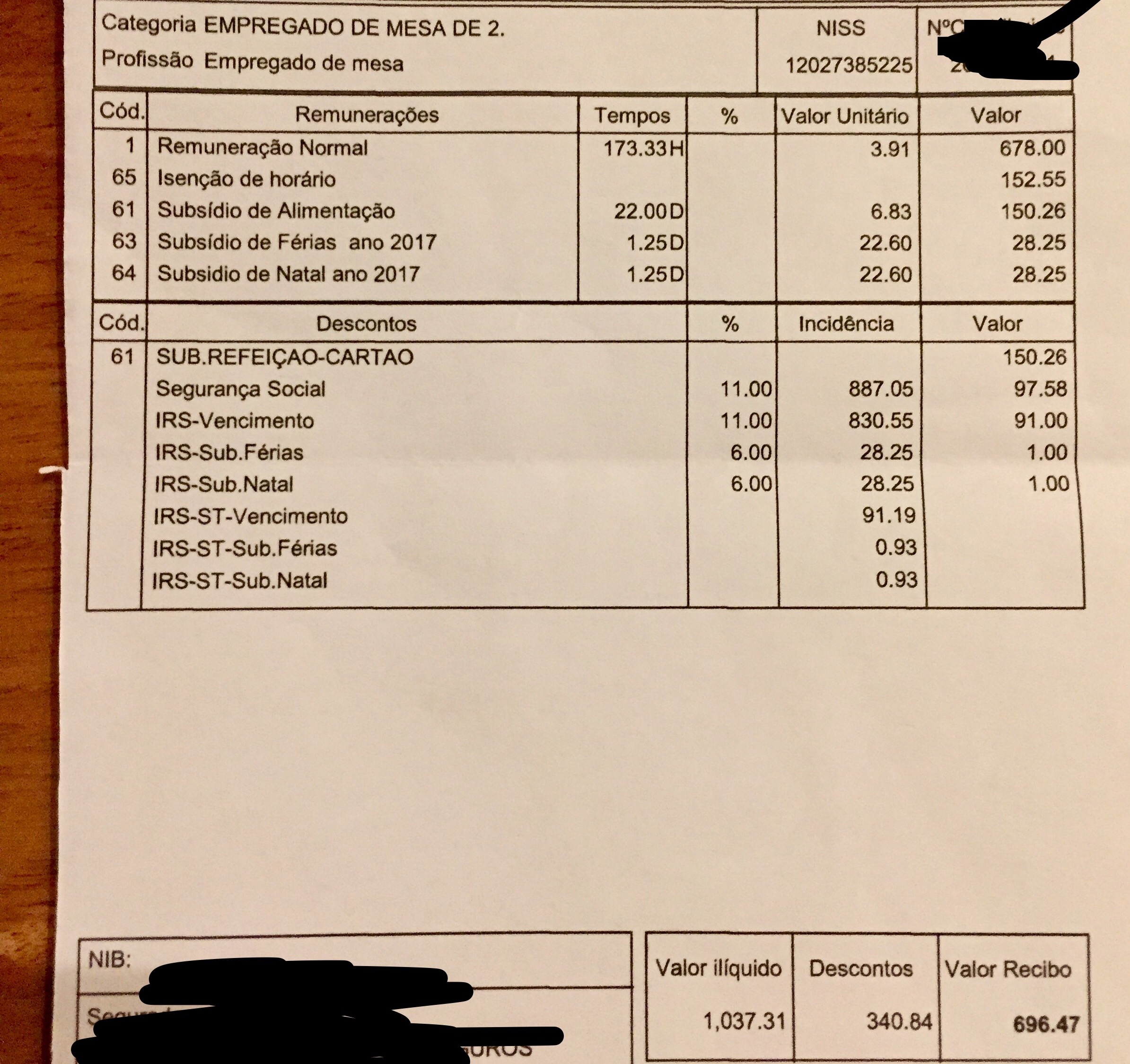 Estou na empresa à 4 meses, com contrato de efectivo. E tenho alimentação no local de trabalho. Salário base 678€+152€ de subsídio de isenção de horário + 150€ de subsidios de alimentação em cartao + 1 subsídio em duodécimos.
