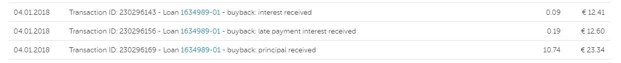 Como vês, devolvem-te o dinheiro investido (10.74€), os juros "normais" (0,09€) + os juros de mora (0,19€). Este era um short loan de 30 dias.