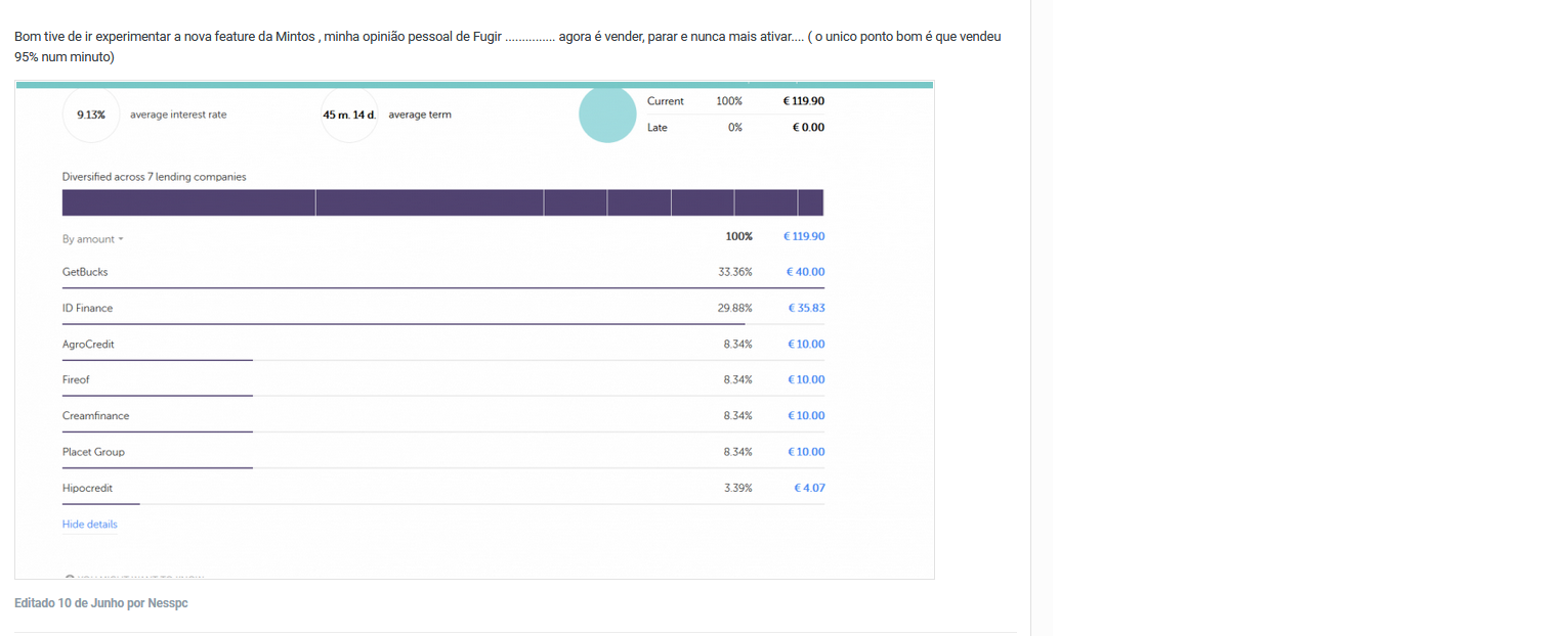 Reacção de fugir como disse e nunca mais voltar, vejo essa resposta todos os dias em todos os bloggers, Grupos Facebook, fórums, etc,,,,,  no entanto todos escrevem um extra como eu como podem ver "o unico ponto bom é que vendeu 95% num Minuto",  Todos os investidores referem isso inclusive a própria Mintos que é a Bandeira do Produto !!!