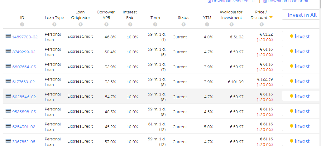 Ex, Express Credit tens taxas 10% com 2% desconto e taxas 15% com 0,9% desconto todos até 60 meses, no entanto só compram com taxas 14% com desconto 0,5% a 22 meses...  é muito para assimilar até chegar aqui  mas como vou conhecendo cada dia mais os LO vou conseguindo fazer o mesmo com mais naturalidade.... Outro Exemplo Akulaku 10% a 5 meses ninguem quer aquilo, mas consigo comprar e vender quase durante 24 horas seguidas para manual picks, AI's e IA's , depois vou variando diariamente os LO conforme saída de Loans e adaptando o capital disponível a novos loans