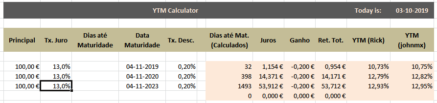 Por exemplo este meu Peachy apresenta um YTM (correcto) de 11% e a minha fórmula (versão uma mensalidade) dá 11.57%.