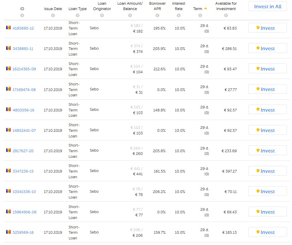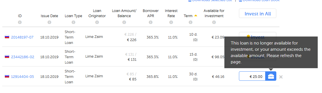 Esta imagem é de uma hora atrás,  todos estes loans permaneceram listados por mais de 15 minutos e nunca estiveram disponíveis. Não é que quisesse comprar especificamente alguns destes loans, foi mesmo para testar que não acontece apenas nos que são lançados com maiores taxas. Actualmente o que apareçe listado nas páginas é informação desactualizada e com bastante atraso.