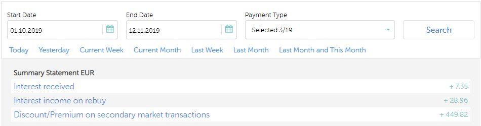 Isto para mim significa que vou ficar um ano sem receber juros correspondentes de  1 ano. Então primeiro pagamento é a 15-11-2019. Tudo ok. Segundo pagamento a 15-12-2020!! 2020!!! E está previsto receber apenas 1 mês de juros isto é 1,45 euros.. E o resto? 26% de rendimento a onde???