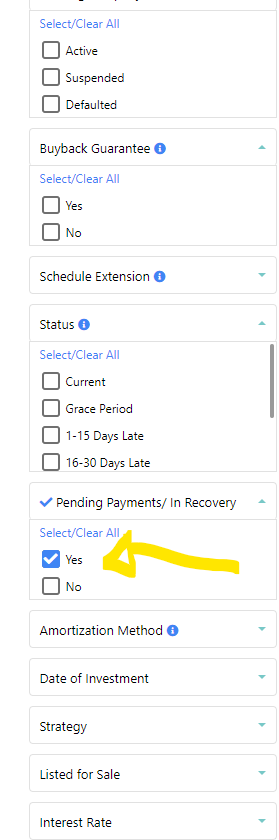 Só indo ao "finished investments" , selecionar os "in recovery" e fazer download da lista para depois filtrar.