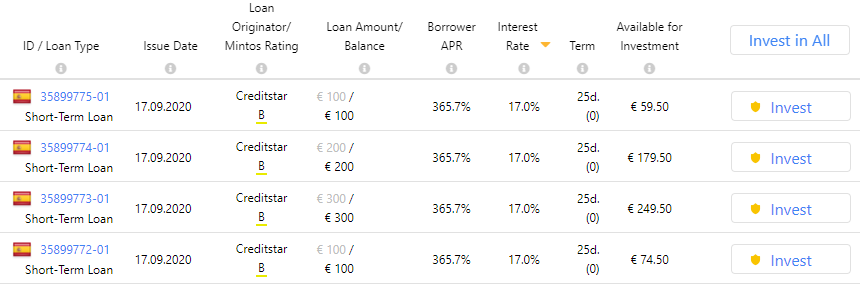 Na Mintos, o Creditstar Group, chegou a ter loans a rondar 20% em Março-Abril. Cheguei a ver loans a 19% e a 21%.