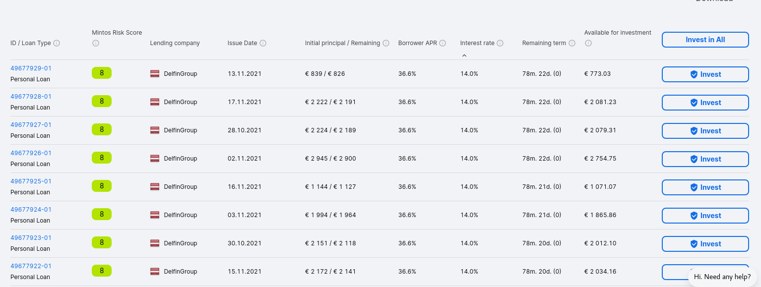 Letónia, Buyback, 14% e full amortization, pelo que o risco de perda total vai baixando com o passar do tempo. O problema é o remaining term que chega a ser de 78 meses. Claro que sabemos que se o mercado ficar mais favoravel para juros mais baixos, vem a DelfinGroup e compra os emprestimos todos de volta, mas parecem-me taxas finalmente a niveis interessantes na Mintos.