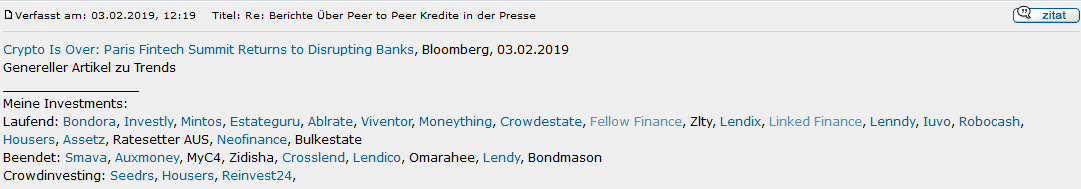 Ainda tens o fórum Alemão, o P2P-Kredite.com, o meu favorito, (também vou a P2P Independent Forum, mas é um pouco parado nas plataformas fora do RU, é mais virado para a realidade do P2P Lending do RU):