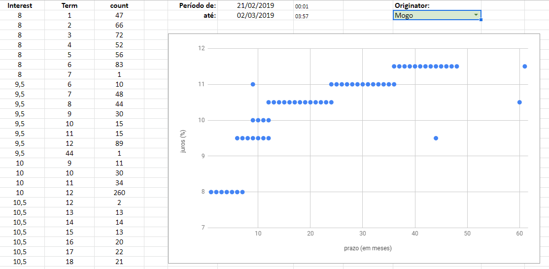 Fiz esta planilha no Google Sheets para me ajudar a definir o autoinvest da Mintos.  Ela mostra o que foi ofertado nos últimos dias na Mintos, os juros e prazo dos loans de um LO. Funciona apenas para loans com buyback e em Euro. Além disso, é bem pesada (não deve rodar em smartphone).