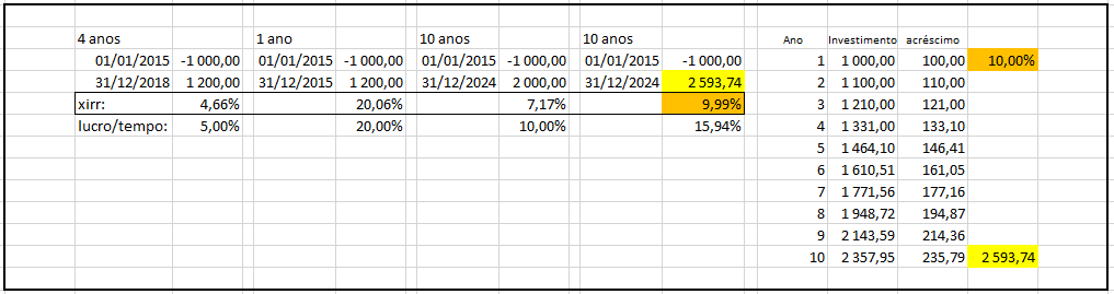 A "AROI" é sempre a mesma, só que tinha que ser é uma taxa simples anualizada ( retorno/principal ), o Excel calcula a XIRR com os mesmos parâmetros, mas inclui o tempo aos segundos, e não ao dia/mês/ano. Ou seja, a XIRR do Excel usa a capitalização continua. No curto prazo,  na XIRR do Excel, nota-se mais a capitalização contínua, mas depois esta dilui-se e fica perto da taxa simples anualizada.