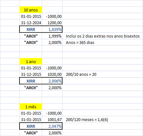 A "AROI" é sempre a mesma, só que tinha que ser é uma taxa simples anualizada ( retorno/principal ), o Excel calcula a XIRR com os mesmos parâmetros, mas inclui o tempo aos segundos, e não ao dia/mês/ano. Ou seja, a XIRR do Excel usa a capitalização continua. No curto prazo,  na XIRR do Excel, nota-se mais a capitalização contínua, mas depois esta dilui-se e fica perto da taxa simples anualizada.