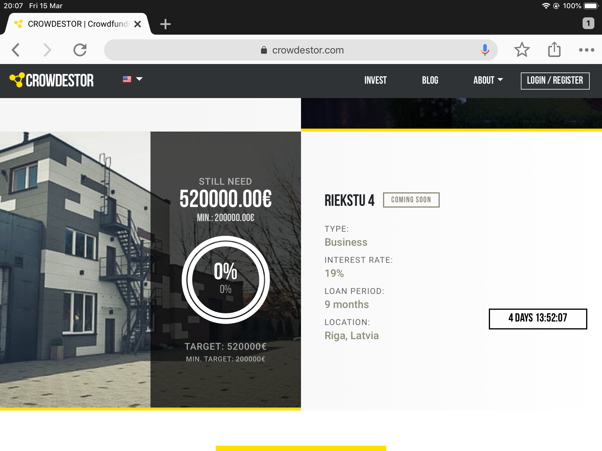 Reforcei hoje a Crowdestor após ter esgotado a o capital disponível para investir. Neste momento estou em 4 loans. Foi a ultima plataforma que entrei.
