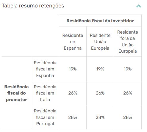 Resumindo, ao declarar os rendimentos na declaração de IRS, tem de se incluir rendimentos obtidos em Espanha até a data e no futuro incluir os rendimentos obtidos em Espanha e em outros países aonde os promotores forem residentes fiscais. É retido o imposto referente ao país de residência fiscal do promotor e os investidores terão que pagar a diferença em falta à autoridade tributária da sua residência fiscal.