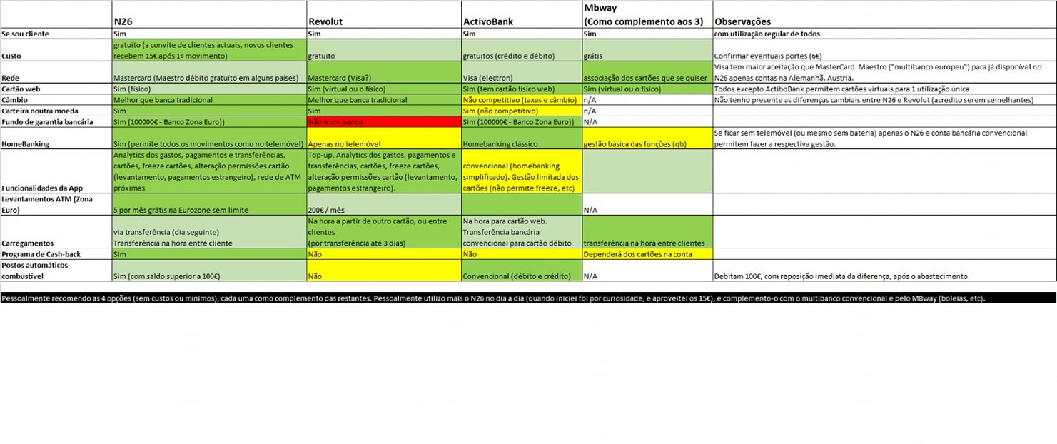 Partilho uma tabela(imagem em anexo) comparativa entre N26/Revolut/Activo Bank que um utilizador no grupo "Revolut Portugal" no Facebook elaborou.