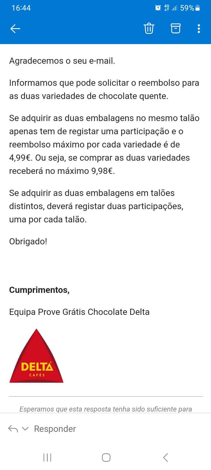 Também recebi o chocolate da delta e das bolachas marinheiras. Foi o refund mais rápido de todos, nem uma semana!