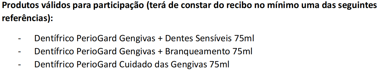 Compre uma pasta de dentes PerioGard, submeta o seu comprovativo de compra e receba o seu dinheiro de volta (até 6,00€). Limitado às 1000 primeiras participações. Campanha válida de 01 de Maio a 30 de Junho de 2023.