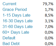 Eis a percentagem de currents por rating para os meus empréstimos com mais de 1 mês: