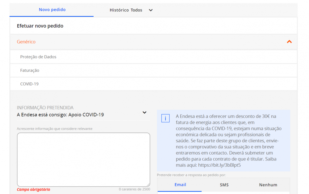 A comunicação pode ser feita por telefone (800 10 10 33, nunca utilizei) ou na área de cliente online My Endesa.