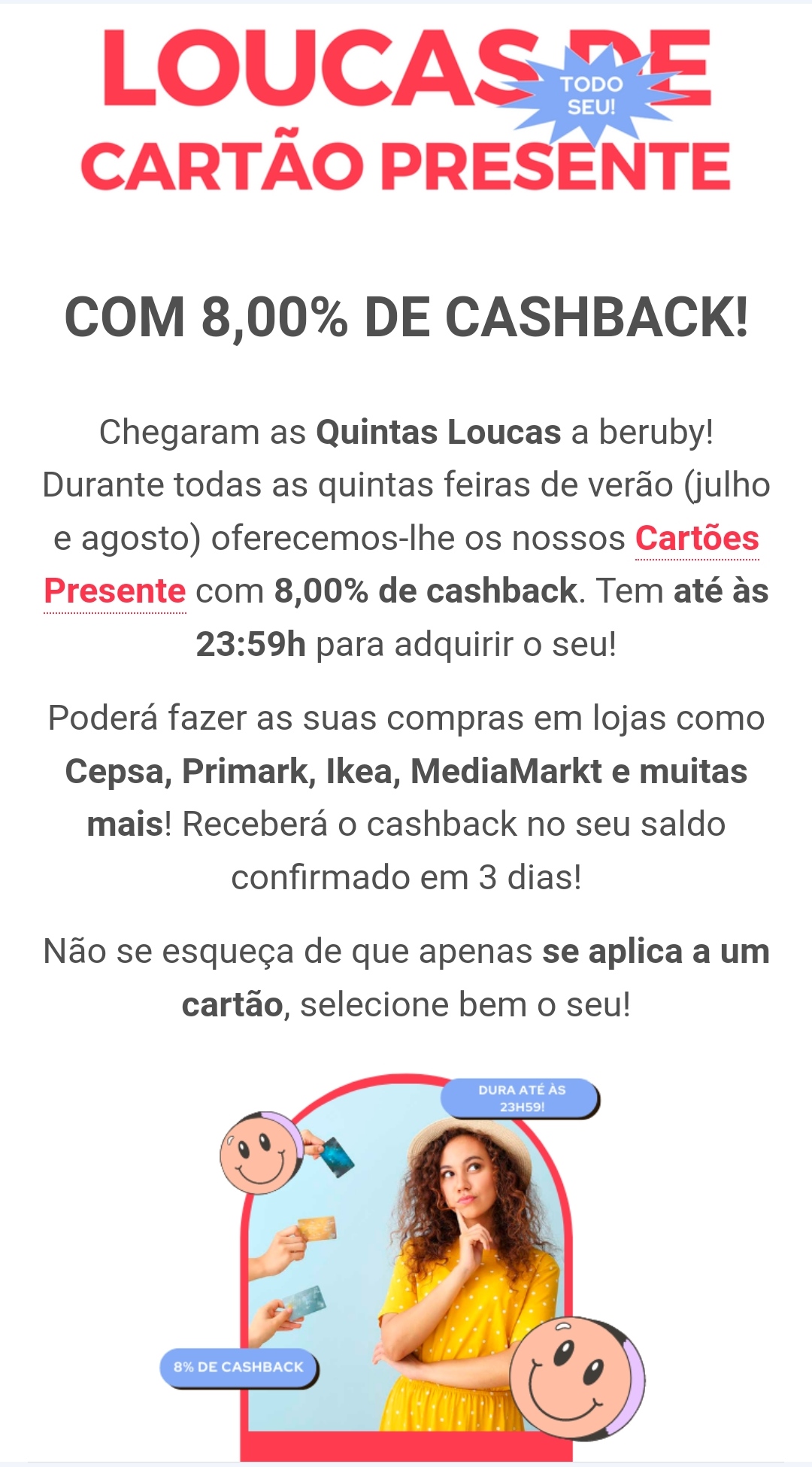 Recebi um mail sobre as quintas loucas, todas as quintas um cartão presente a 8% durante o Verão. Mais alguém recebeu?
