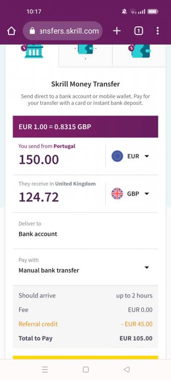 A Skrill oferece bonus por transferencia internacional (funciona bem EUR-EUR). Enviam 150€ e pagam 135€ na primeira transferencia. O bónus é 15/15 e cada um pode ganhar 100€ em referidos. A Skr
