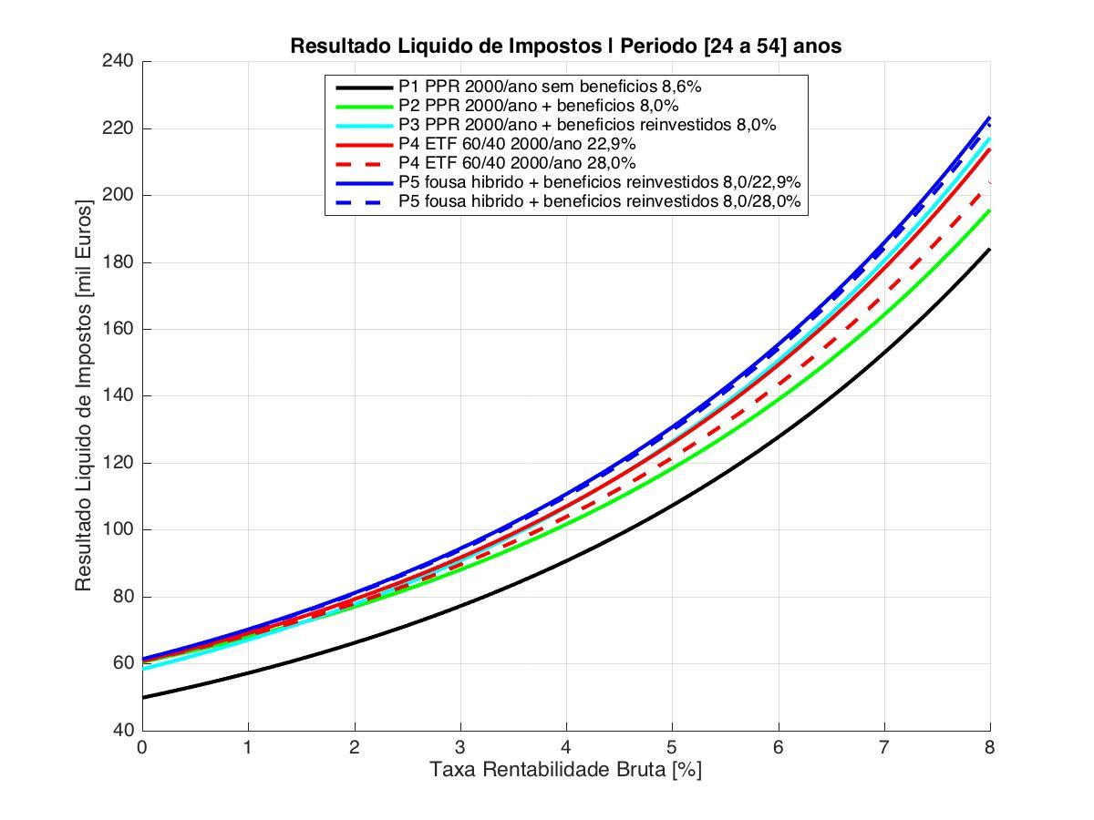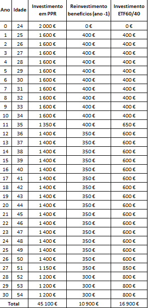 Um híbrido: Investe no total 2000€ em cada ano,  no período [24anos, 54anos], investe o montante para dedução máxima consoante a idade, reinvestindo os benefícios fiscais no mesmo PPR. O dinheiro que sobra até perfazer 2000€, investe num ETF 60/40