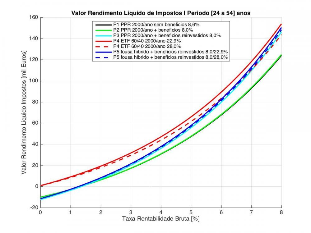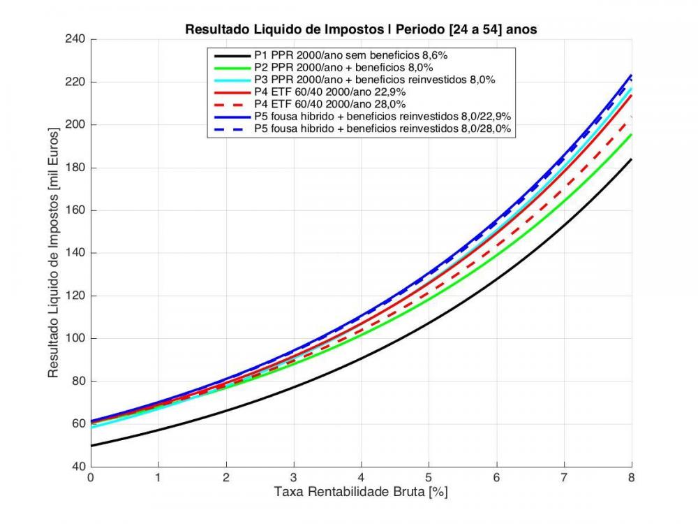 Ha' uns meses fiz umas "contas nas costas de um envelope" (deformacao profissional...) e as minhas conclusoes resumiram-se a isto: um PPR que esteja numa classe de risco 5 (no limite inferior ~10%) equivalente 'a volatilidade de uma carteira de ETF 60/40 (isto e´, que pode ter possibilidade de rentabilidade comparavel no longo prazo) tem de ter um custo inferior a ~1,0% se quiser pelo menos ter a possibilidade de no final de 20 anos e depois de serem aplicados os impostos a ambos os investimentos (~8% contra 28% actualmente) retornar um valor semelhante ao investidor.