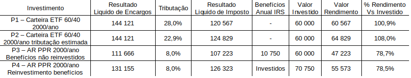 Em relação aos resultados, parecem-me claros. O efeito acumulativo é importantíssimo e os encargos borram sempre a pintura. Mesmo com os benefícios fiscais à entrada e menor fiscalidade à saída do PPR, o valor de rendimento VS o valor que investimos são favoráveis ao ETF 60/40. Adicionando o risco de uma carteira activa do PPR vs carteira passiva do ETF, o ETF sai um claro vencedor.