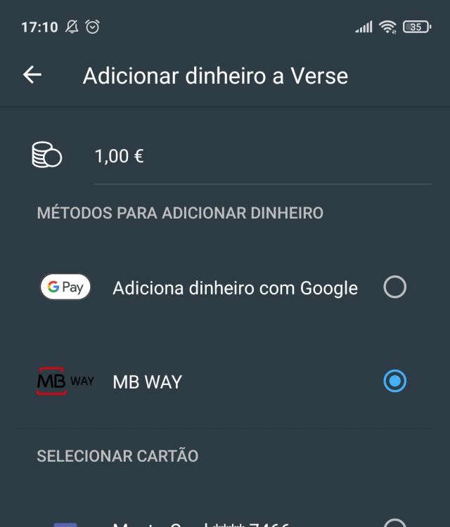 Vais a adicionar dinheiro a Verse, depois selecionas o valor que queres e depois escolhes MBWay