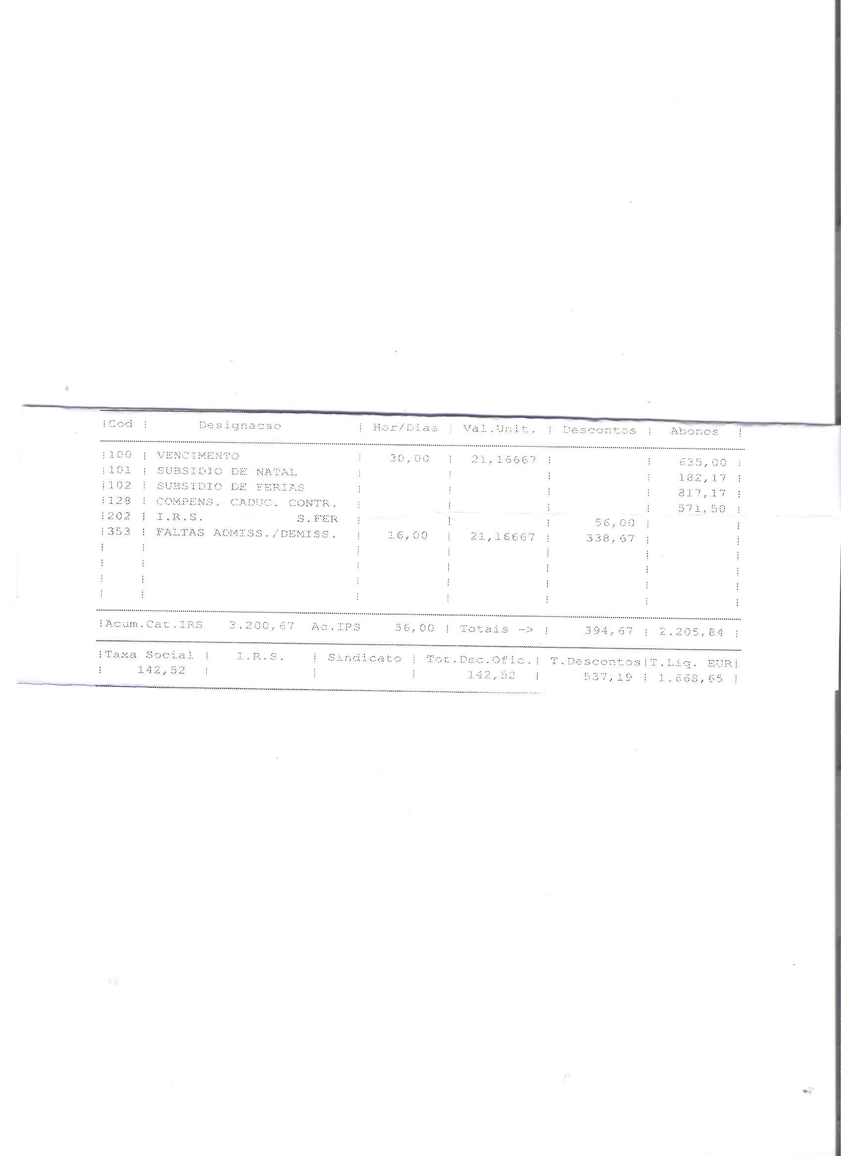Quantas férias tinha por gozar? Quantas já gozou? Só recebia o salário minimo ou tinha algum outro complemento? Antes do final do contrato já tinha recebido alguma parte do subsidio de natal? E do subsidio de férias?