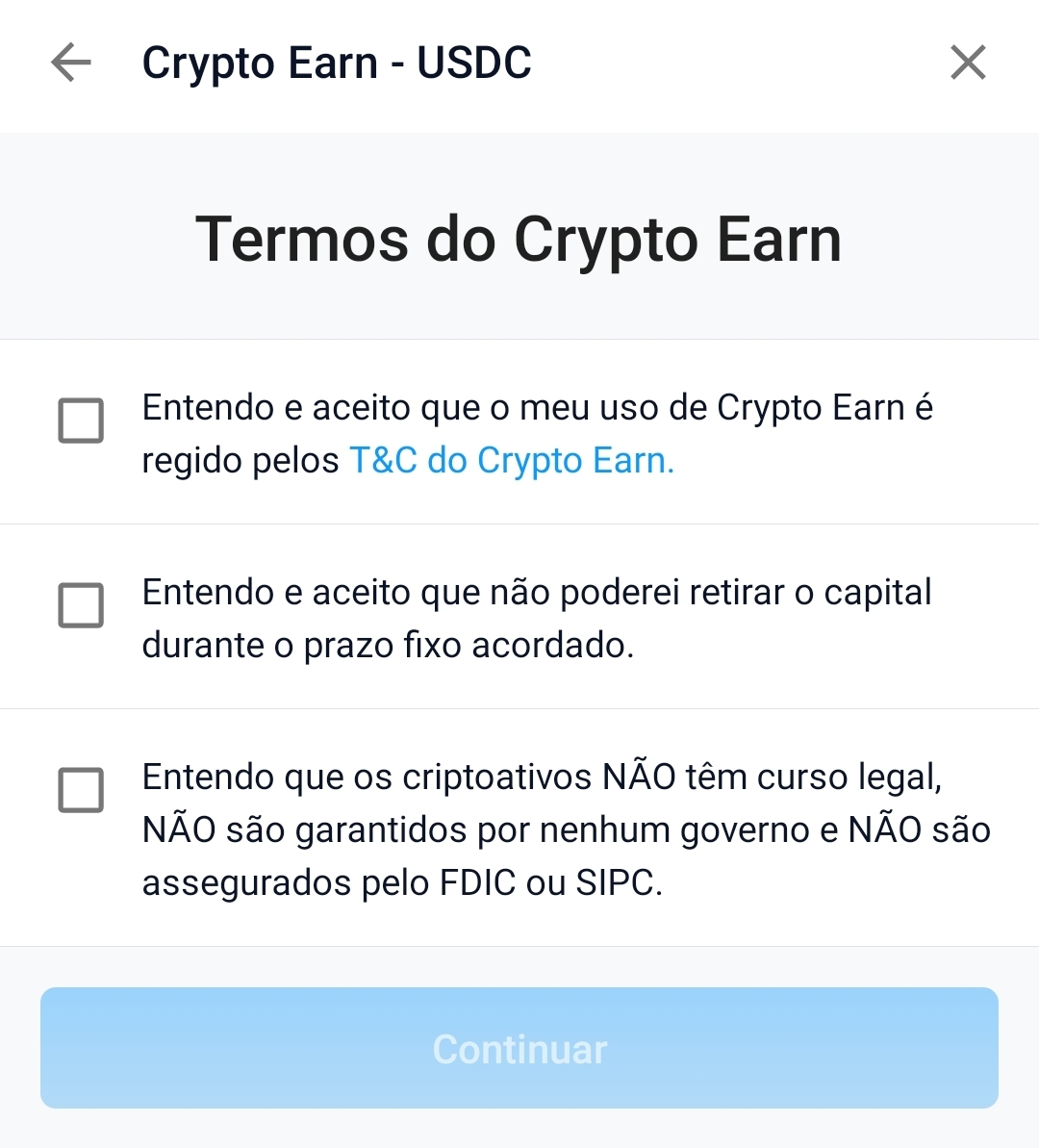 O Crypto Earn dá uma taxa de 10% para o USDC, que é uma moeada bastante estável.