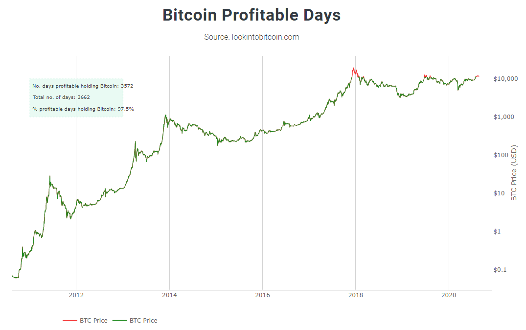 Como podem ver, até ao dia de hoje, comprar e segurar BTC é uma estratégia rentável em 97.5% dos dias desde que a BTC foi criada. Estamos a falar de uma história de praticamente 10 anos.